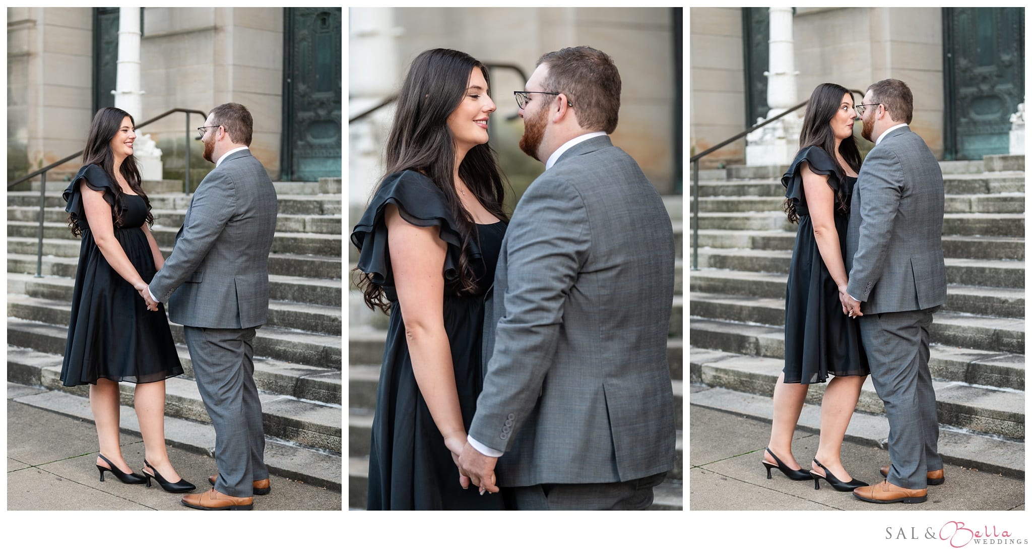 Marissa looked beautiful in a chic short black dress. The flowing fabric moved gracefully as she and Joe wandered around the Mellon Institute. Her radiant smile matched her effortless beauty as she gazed at Joe, who looked sharp in a classic grey suit. The combination of her black dress and his tailored suit created a timeless look that perfectly suited the historical charm of their setting.