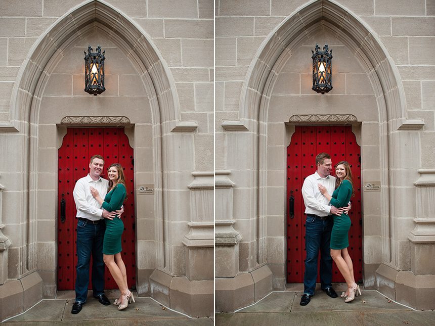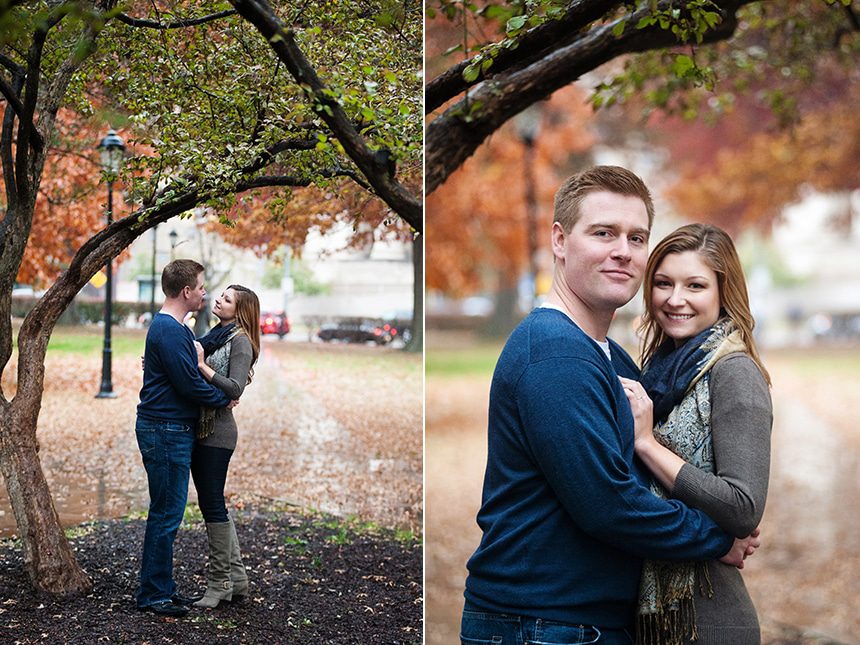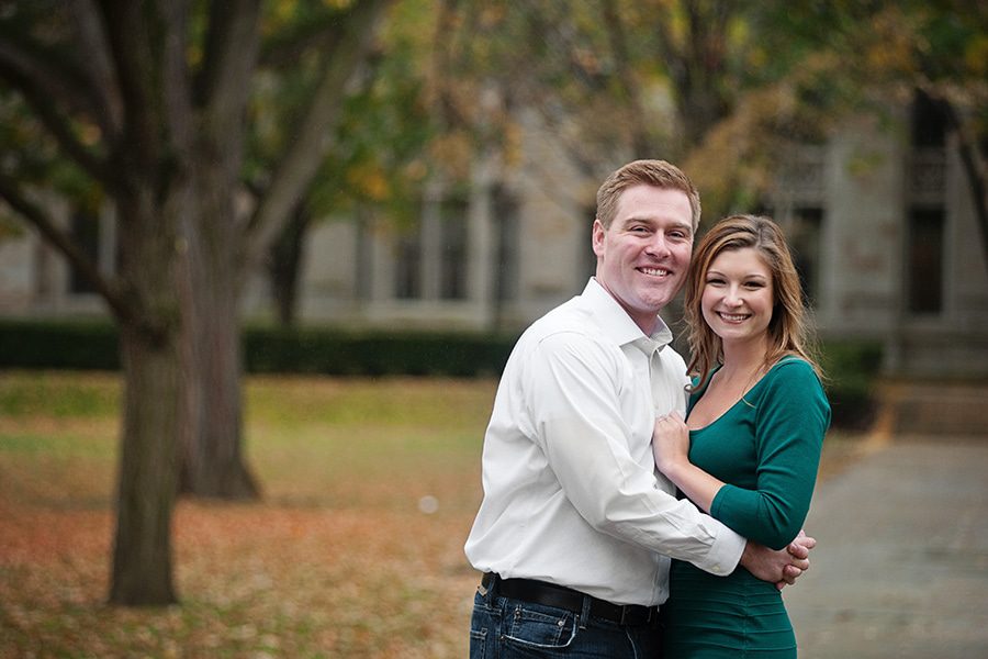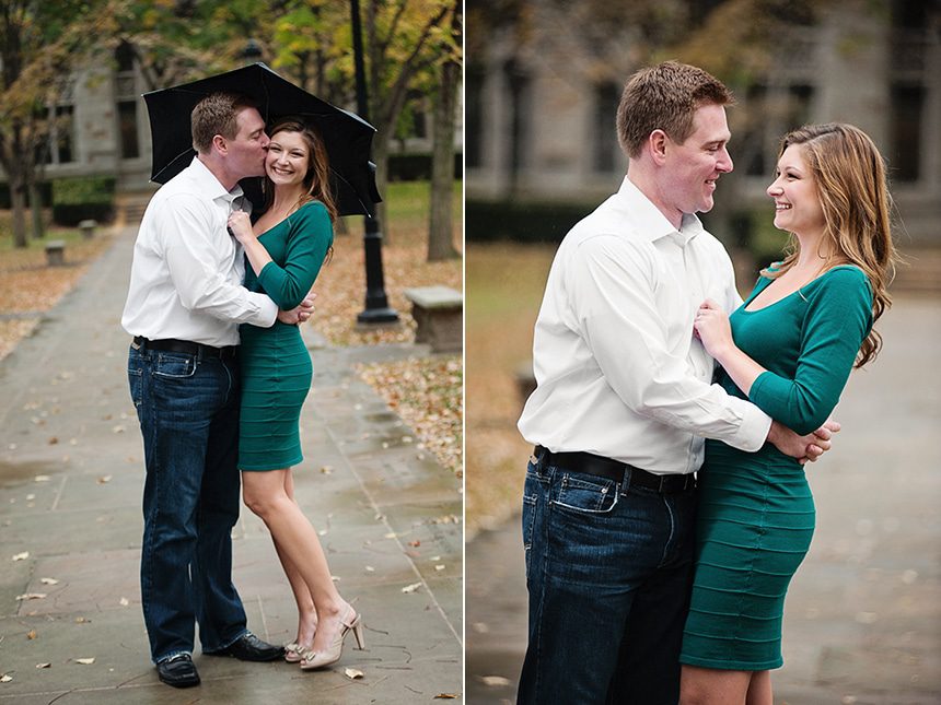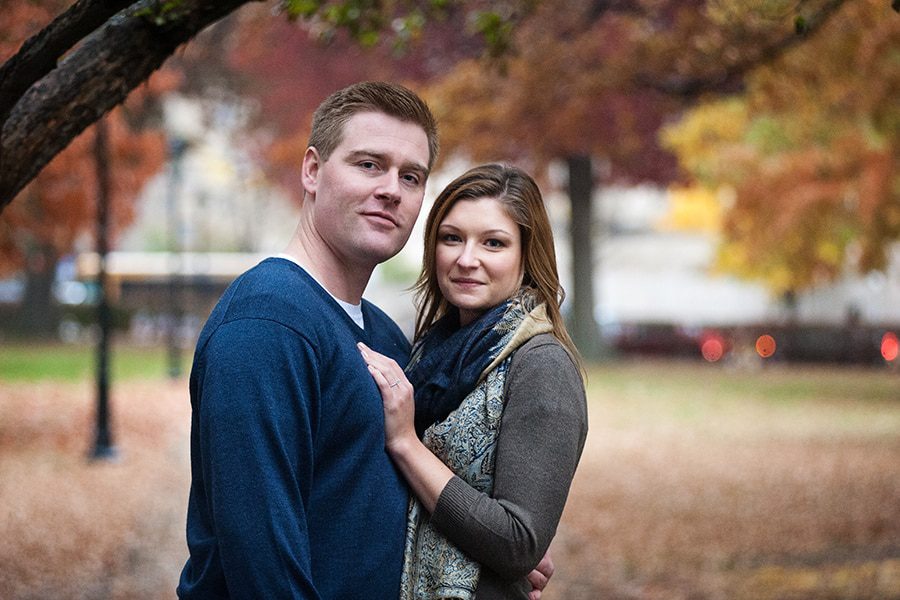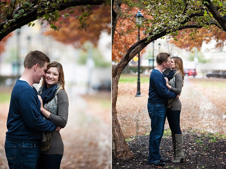Meet the love birds, Jessica & Billy. They are to be married this New Years Eve. I’m so excited for their wedding. We met up the last weekend in October to shoot their engagement session. The week before their session we kept an eye on the weather, and the forecast was not looking promising with a 60% chance of rain, along with a chilly day. The weekend came and without fail that rainy Pittsburgh weather joined it. Jessica and Billy were only in Pittsburgh for the weekend (as they live in Philly.) So we decided what the hay lets do it in the rain, we can use umbrellas. So we did and had an amazing shoot. We hit Pitt Campus where the two first met.