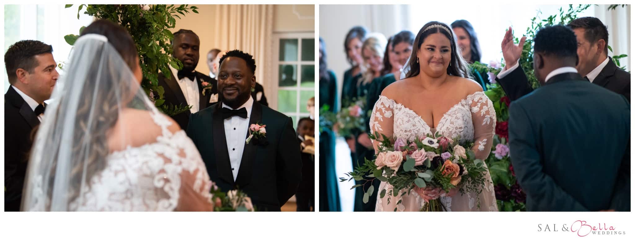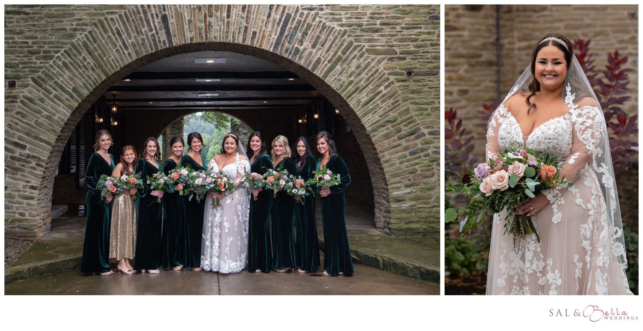 We were obsessed with the color palette for this wedding! Gabrielle chose emerald green for her bridesmaids, and it was the perfect choice. It gave off cozy fall vibes without leaning on the typical autumn color scheme. Their design choices brought a sophisticated, modern feel to the entire celebration.