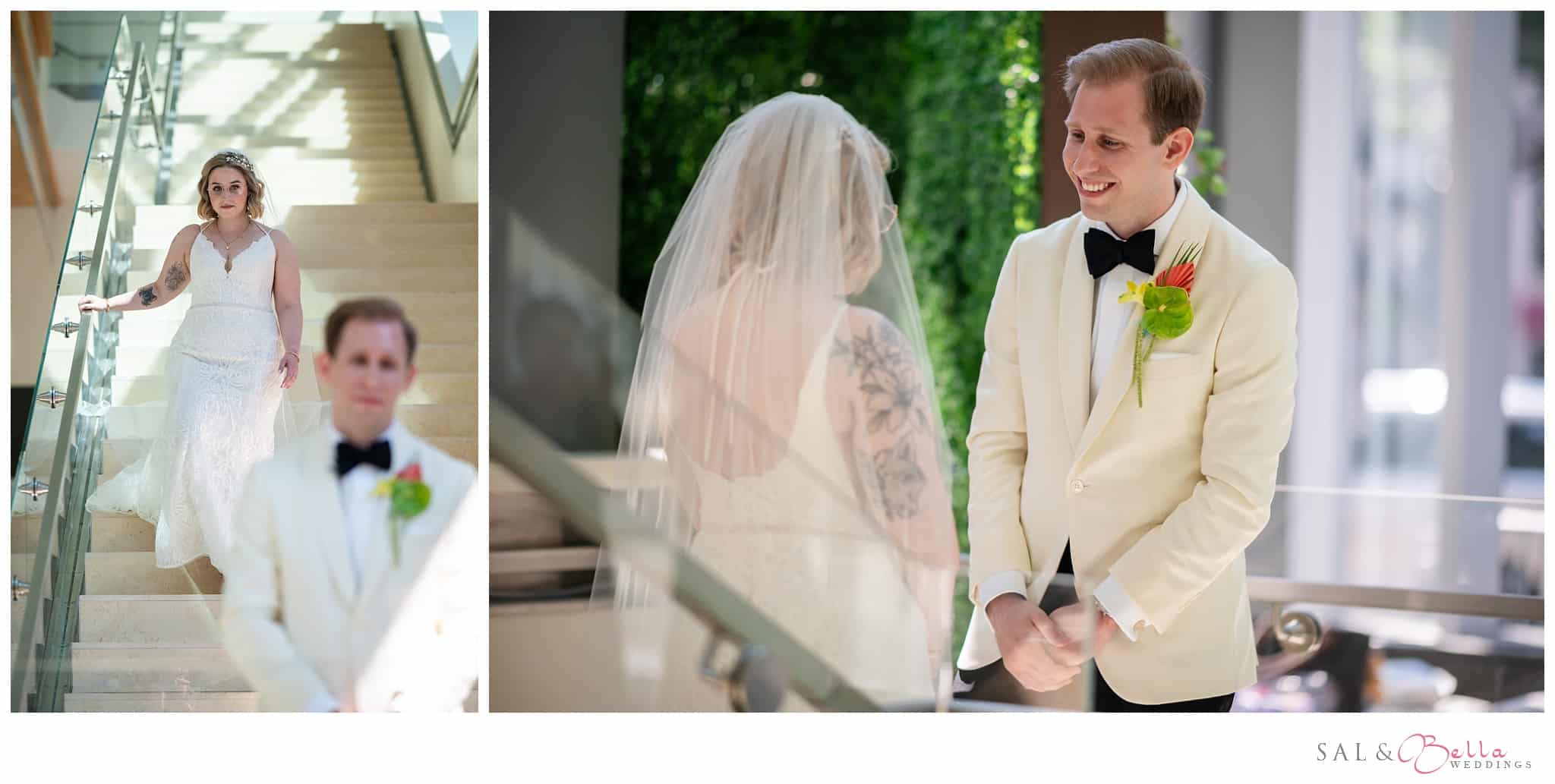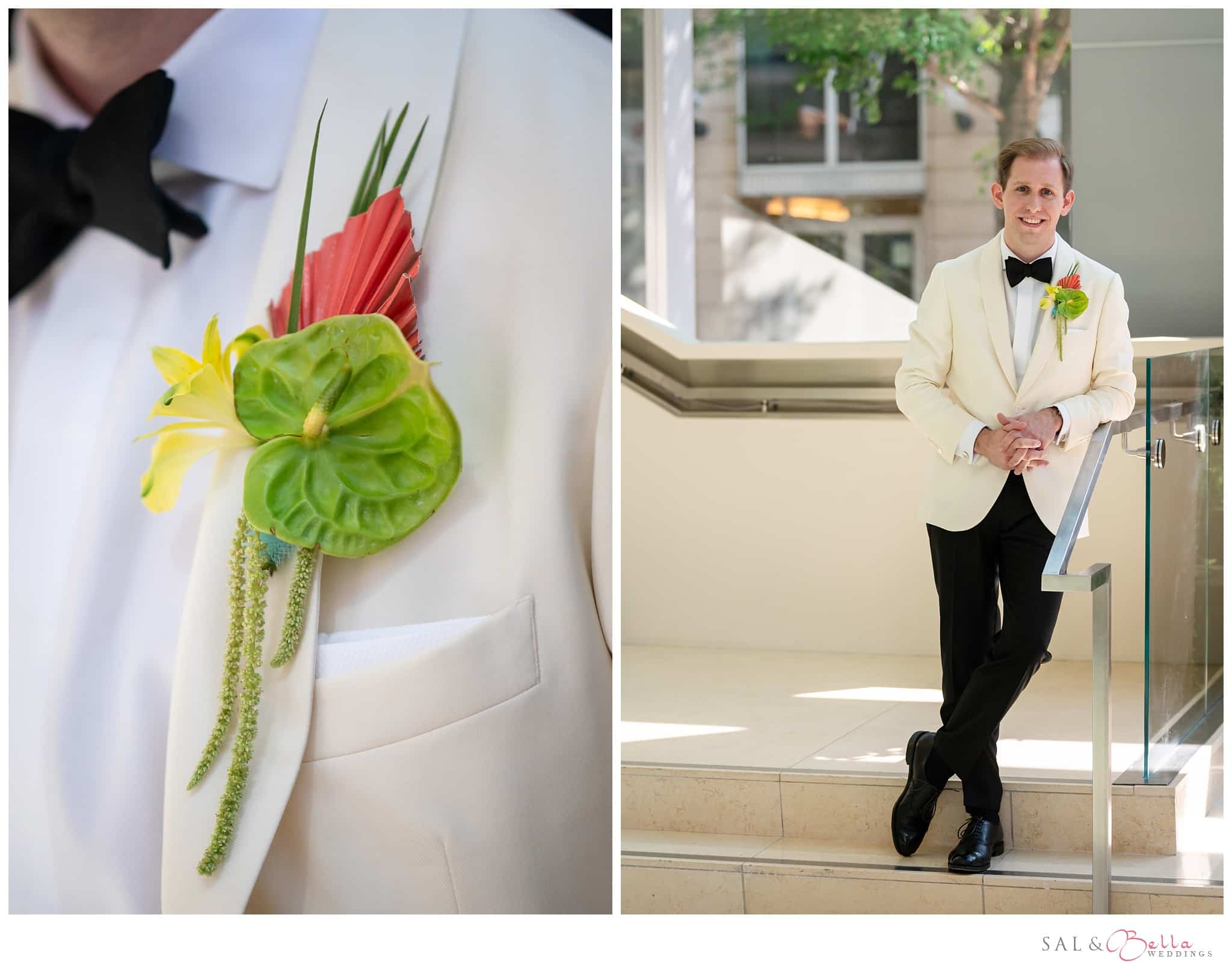 Ali, the radiant bride, was the epitome of elegance with a modern twist. Her gown, a beautiful blend of classic and contemporary, with its chic silhouette and intricate detailing. Jason, ever the cool groom, wore a tailored suit that would make Crockett and Tubbs proud, with a crisp white jacket and black trousers that channeled a suave, Miami street-style elegance.